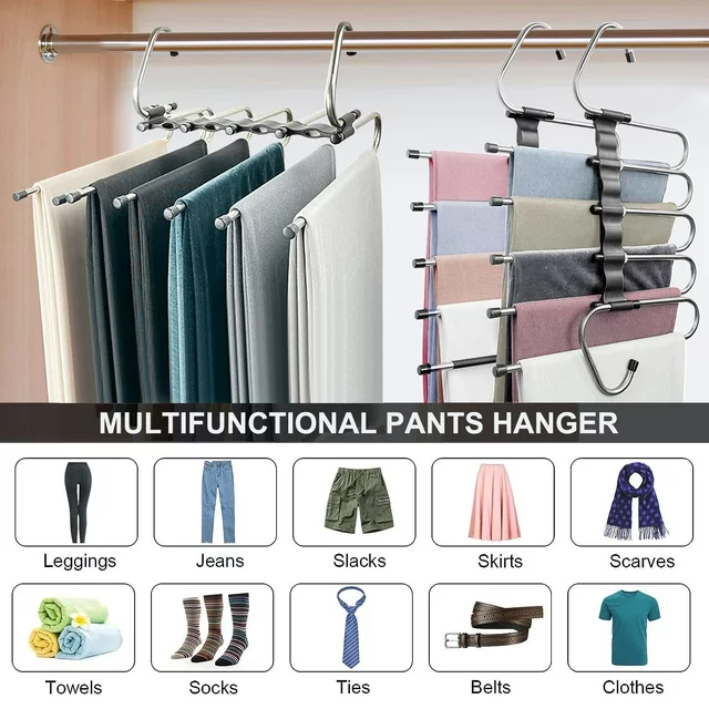 【80% Space Saving】-This is a unique vertical/horizontal two use multifunctional pants rack hanger.Each one can holds up at least 5 pants or jeans.Maximum saving space,and keeping your closet neat and tidy.