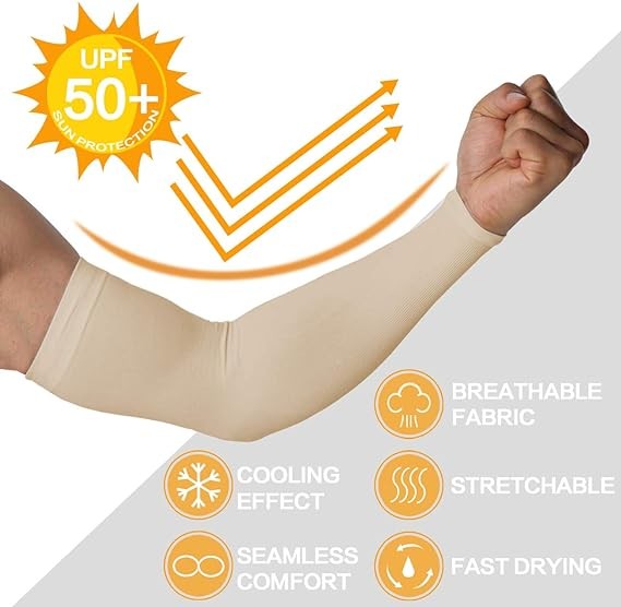 DURABLE MATERIAL - Cooling Arm Sleeve is made of durable, weather resistant and stretchy material. Arm Covers are chemical FREE and completely safe for you and your kids. Material is breathable, dries fast, wicks moisture away from the skin and makes your skin feel fresh all day.