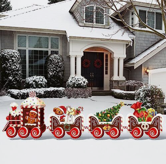 These Christmas train outdoor lawn signs are designed with gingerbread man, Christmas tree, bear, gift box and more, which are classic Christmas elements, easy to set off a happy and warm atmosphere.