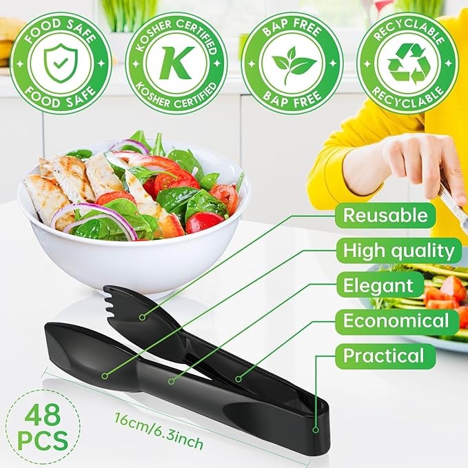 48 Pieces of 6 Inch Plastic Tongs: each serving tong is 6 inches long, easy to grip, and comfortable to use; Convenient design is nice for all your dinner party, catering or buffet needs; They can be hand washed and reused, or discarded after one use