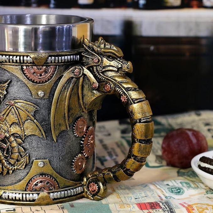 GUZZLING DRINK - This steampunk dragon mug is 5.7" tall, 6.65" long , wide 4.14",weighs 1.59 lbs. Can hold up to 21 ounces of your favorite cold beer, mead, wine, coffee, juice drinks or teas beverage. Nice cups to use during d&d gaming nights or a themed party.