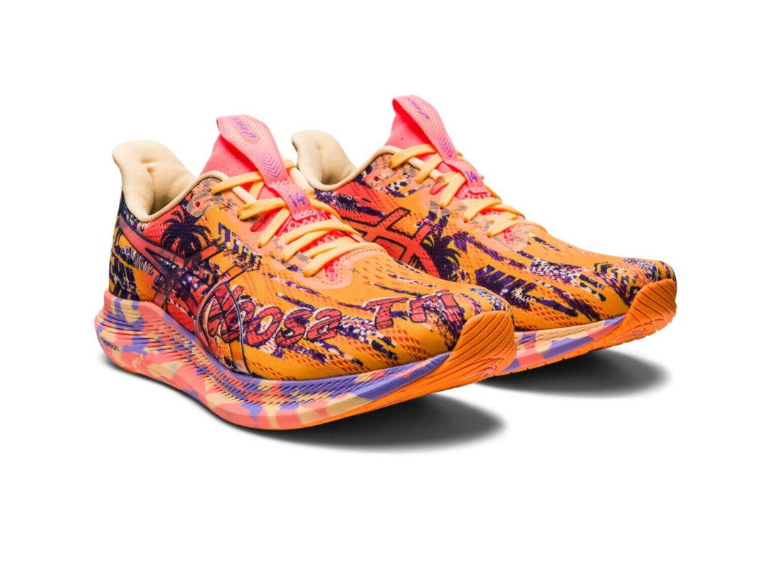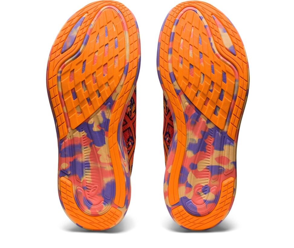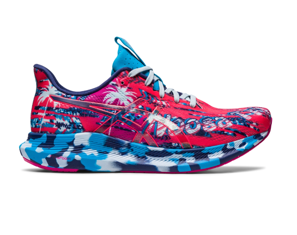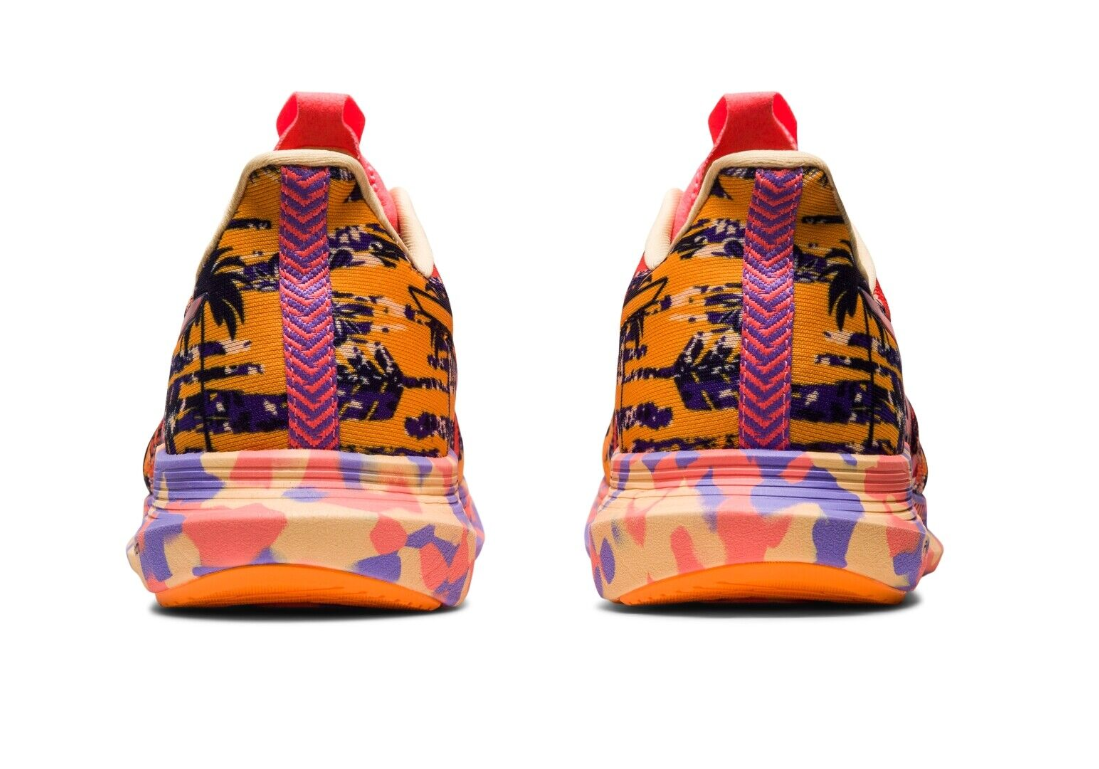 Bold colors and patterns on the engineered mesh upper are inspired by the early GEL-NOOSA™ styles from the 2000s. Convenient features, like the tongue pull-tabs and toggled laces make the shoes easier to put on. This makes it more practical after exiting the swim stage of a triathlon or getting out the door quicker. With GUIDESOLE® technology underfoot, these shoes help reduce ankle flexion. Its curved design allows you to conserve more energy while experiencing an easy forward roll.
