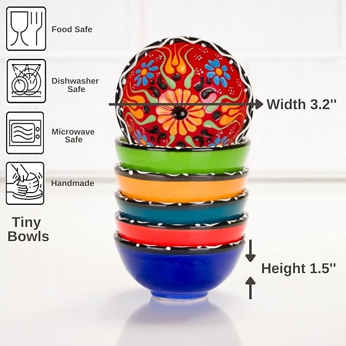 Unique Design & High Quality: Its vivid colors and patterns look amazing. Each bowl is specially handcrafted and unique. Our small bowls are designed to be safely used in microwave, oven, freezer and dishwasher. Made in Turkey with special techniques to last long without wear off. Due to being hand painted, there might be very minor differences between the bowls. This shows authenticity and the uniqueness of the product