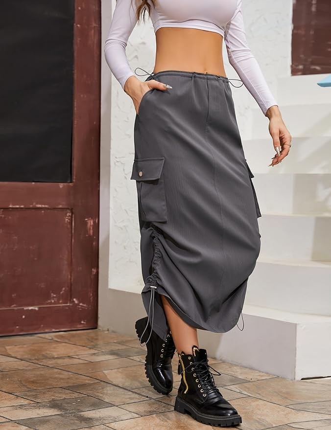 • Features: This stylish cargo skirt combines trendy Y2K aesthetics with practicality. Y2k Cargo Long Skirts for Women features a solid low waist and an elastic waistline with a drawstring design for a customized fit. The cargo skirt long also includes two side function pockets and boasts split ends for added flair.