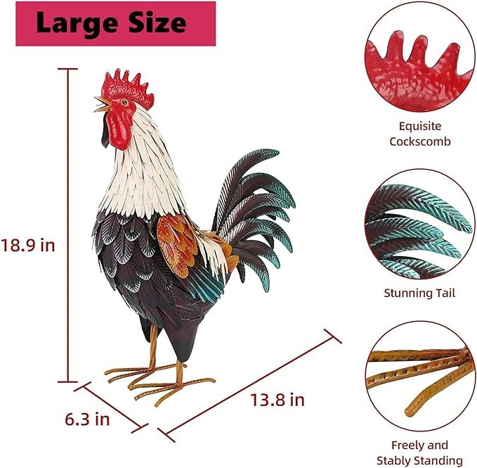VIVID ROOSTER GARDEN DECOR FOR KITCHEN & OUTDOOR. The durable metal rooster yard decor material makes them perfect for yard art and keeps them look brand new all the time. Colorful details make a wonderful addition to the home and garden.