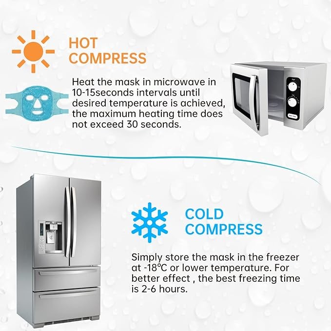 • 【CONVENIENT TO USE】simply store the mask in the freezer at -18℃ or lower temperature for at least 2 hours. Heat the mask in microwave in 10-15seconds intervals until desired temperature is achieved,the maximum heating time does not exceed 30 seconds.
