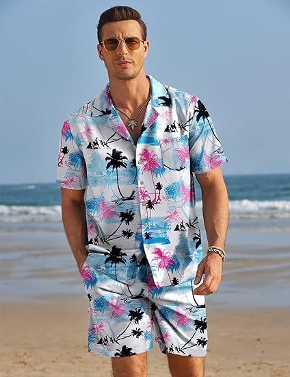 【OCCASION】: Fashionable pattern design, suitable for all ages to wear. Great for tropical aloha theme, camp, cruise, sun beach, birthday party, vacation or any casual daily wear.Simple and classic matching of shirts and shorts sets, save you the time of choosing to match.