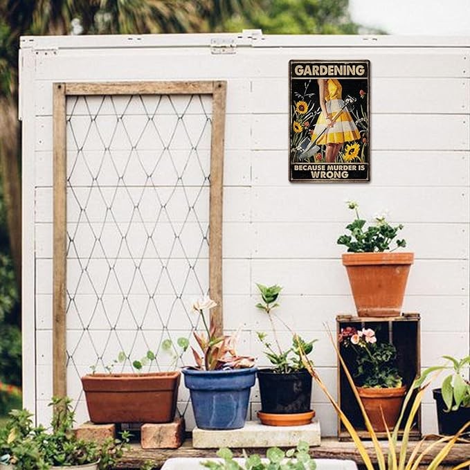 CrazySign Funny Garden Decor Garden Gifts Gardening Because Murder Is Wrong Metal Garden Sign Outdoor, 12" x 8", (263)