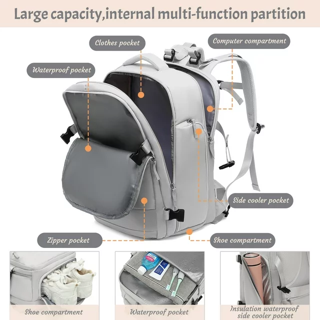 Derstuewe Large Travel Backpack for Women Men, Carry On Backpack for Outdoor Sports , Waterproof Laptop Bag with USB Charging Port, Backpack Flight Approved,Grey