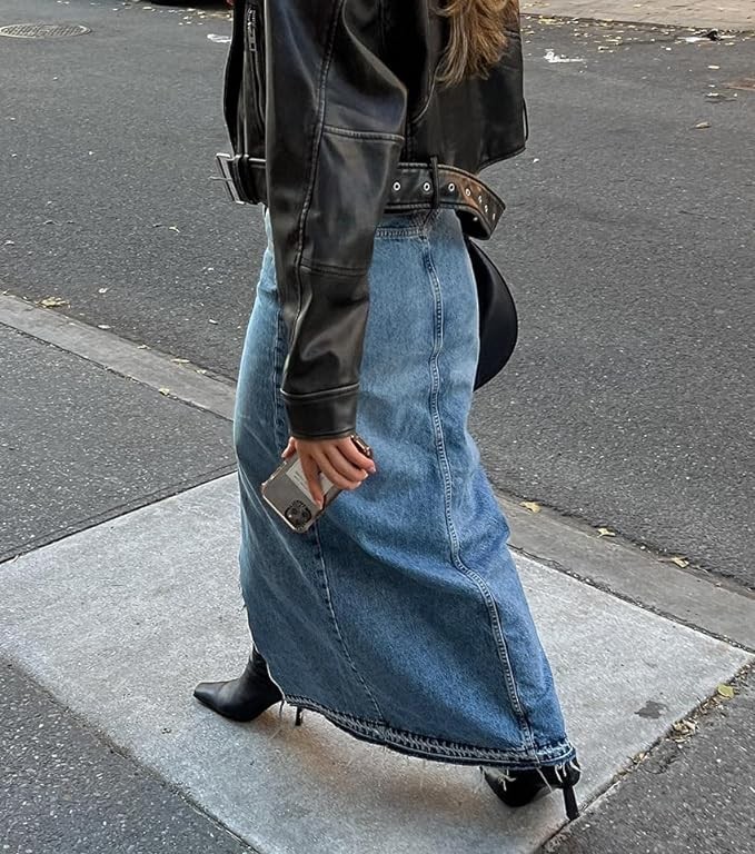 Style: Denim skirts for women, stretch denim skirt, summer maxi skirt, asymmetrical skirt, denim skirt with split, jean skirt, slit skirt, fall or winter sexy skirt, 2024 women skirt, wrap skirt, y2k trendy, high waisted, ruched, pockets on side, ankle length, casual streetwear.