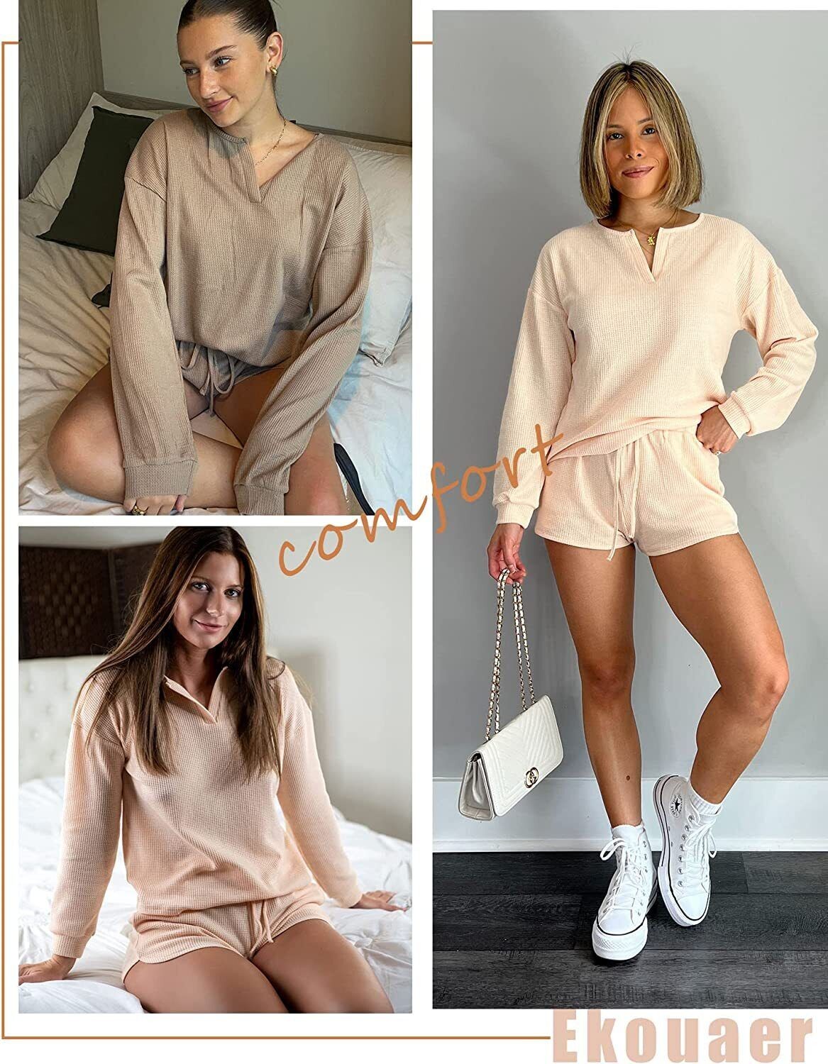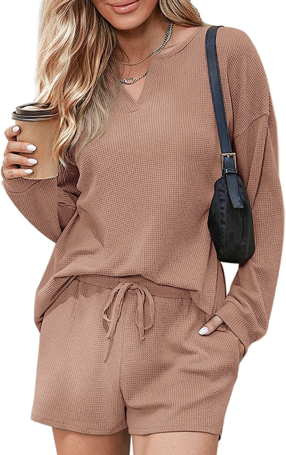 Ekouaer Pajamas Womens Waffle Knit Lounge Set Long Sleeve Top and Shorts 2 Piece