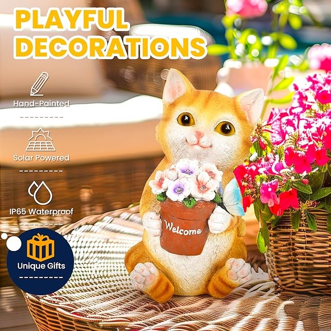 [Unique Design]: Our garden figurine features an adorably designed cat cradling a welcome-bearing flower pot, complemented by innovative solar lighting that brings the piece to life in the evening.This charming design enlivens your garden and welcomes guests with warmth.