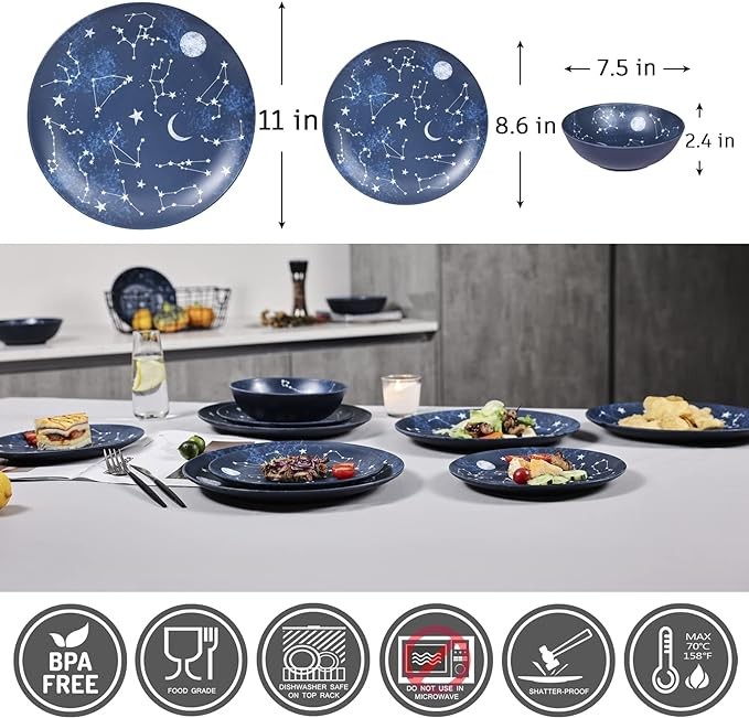 POPULAR STYLE: These melamine bowls and plates are designed with the popular constellation/galaxy pattern, You could see the combination of modern and mysterious, which is very suitable for daily use in the family. Especially good for the party and camping.