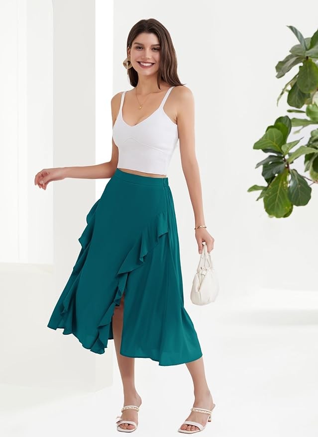 • 【Features】This women's summer midi skirt is featured with elastic high waisted, which can highlight your figure more slimmer. Ruffle trim, 2 side split, below knee length, flowy A-line midi skirt for women.
