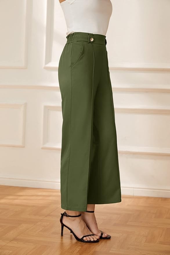 DRESSY DESIGN: 2024 Cropped wide leg slacks are designed with high rise and elastic back waistline, which can contours your curves better, functional pockets are ideal for keeping your cards, keys or phone. Flat front, non-functional button, hidden zip at left side, with open side-entry pockets and belt loops, which is professional for work, interview and any other formal occasions, it's also comfortable for daily activities, like yoga, golf, lounge, date, etc.