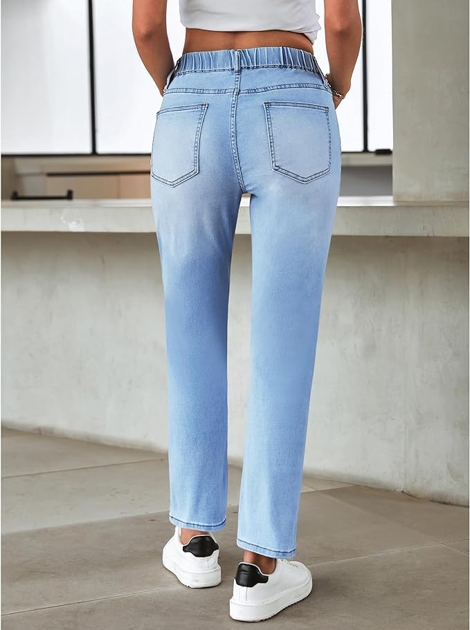 • Ankle jeans Inseam - 28''. This pair of womens stretch jeans has a high rise elastic waistband to create a flattering silhouette by accentuating the waist and elongating the legs.