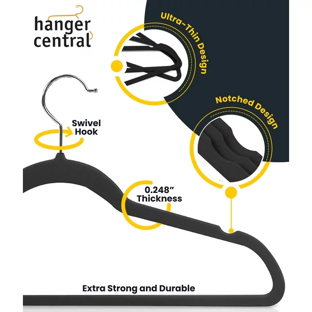 Set of 50 Hanger Central velvet clothing hangers measures 17. 5 by 0.24 by 9.06 inches each; 360-degree rotate feature. Strong enough to hold 10 pounds; ultra-thin construction is sturdy enough to hold your coats and pants. Made of sturdy material; the set of 50 hangers can hold and organize your clothes, saving space and tidying up your closet. Soft velvet, instead of plastic or metal, leaves no crease on a pair of pants when folded over, or a shirt or top hung over top. Non-slip black velvet design, with chrome finishing, ensures secure hanging of your clothes with a slim and sleek construction to maximize space in your closet.
