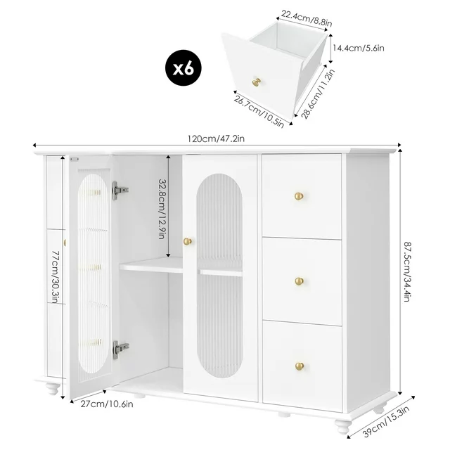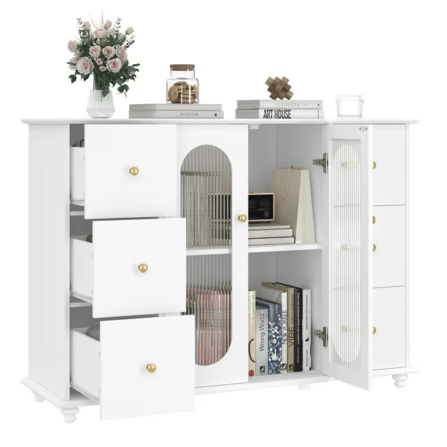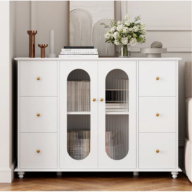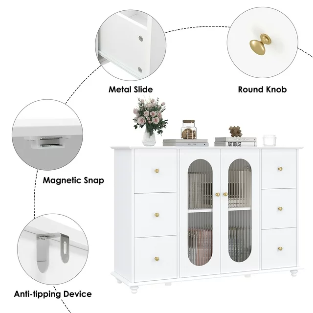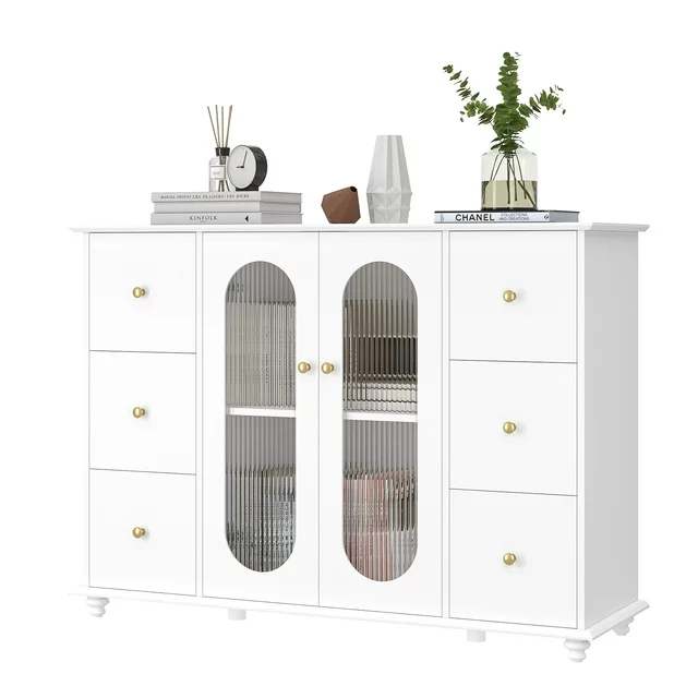 This 6 Drawer Accent Storage Cabinet with Glass Doors is styled in an elegant white color, with fluted glass and gold knob handles adding a sophisticated touch of luxury. It will definitely become one of the most attractive pieces of furniture in your home. The smooth painted finish makes this modern sideboard easier to clean.