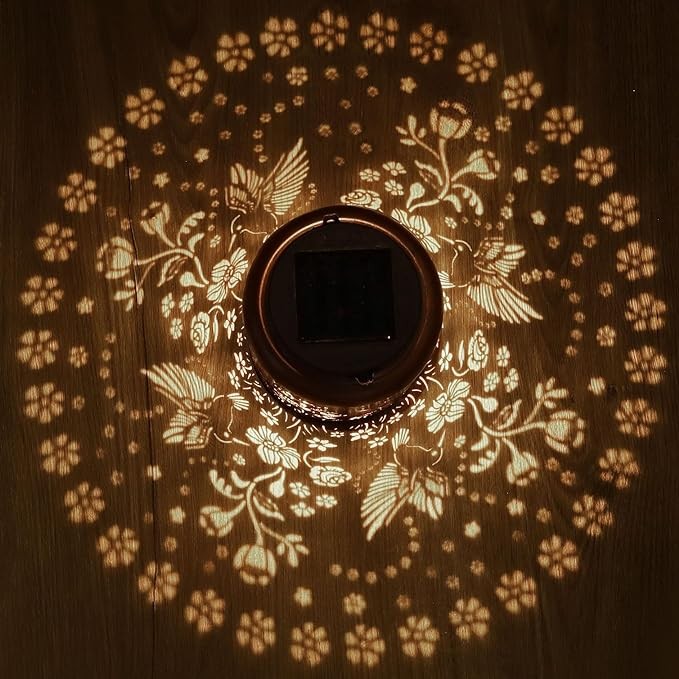 Graceful Decorative Design:The retro appearance, with gold copper color and hollow out metal veneer, the solar outdoor lanterns casts bright and warm light in darkness, accompanied by gorgeous and graceful hummingbird patterns, adding a beautiful atmosphere to the surrounding environment.