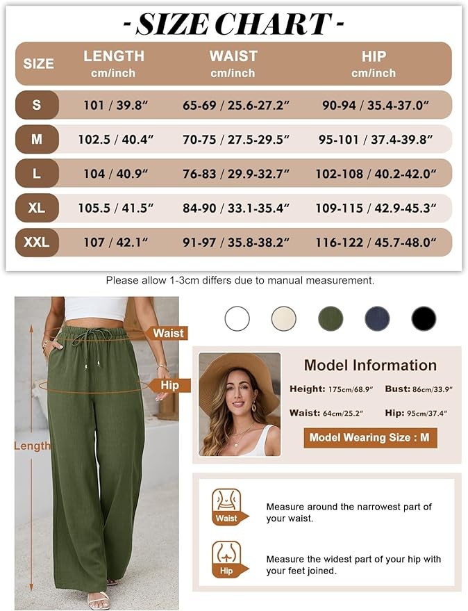 【Elastic Waistband Design】 Wide leg linen pants features with adjustable drawstring, fitting most body shape. Beach pants can be high waist summer palazzo pants or low waist wide leg pants. Classic boho pants with flowy deign can shape your legs.