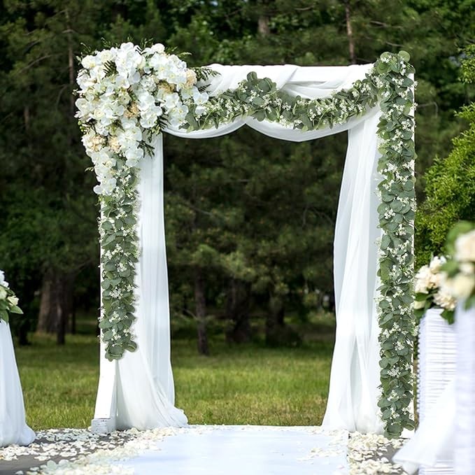 ?【Quantity and Size】Package includes 4 pack faux eucalyptus garlands. Each greenery garland is about 5.9 FT Long, with lush silver dollar eucalyptus leaves and many beautiful white flowers. Our artificial garlands look very full, three-dimensional and layered, and more dense than other hanging vines.