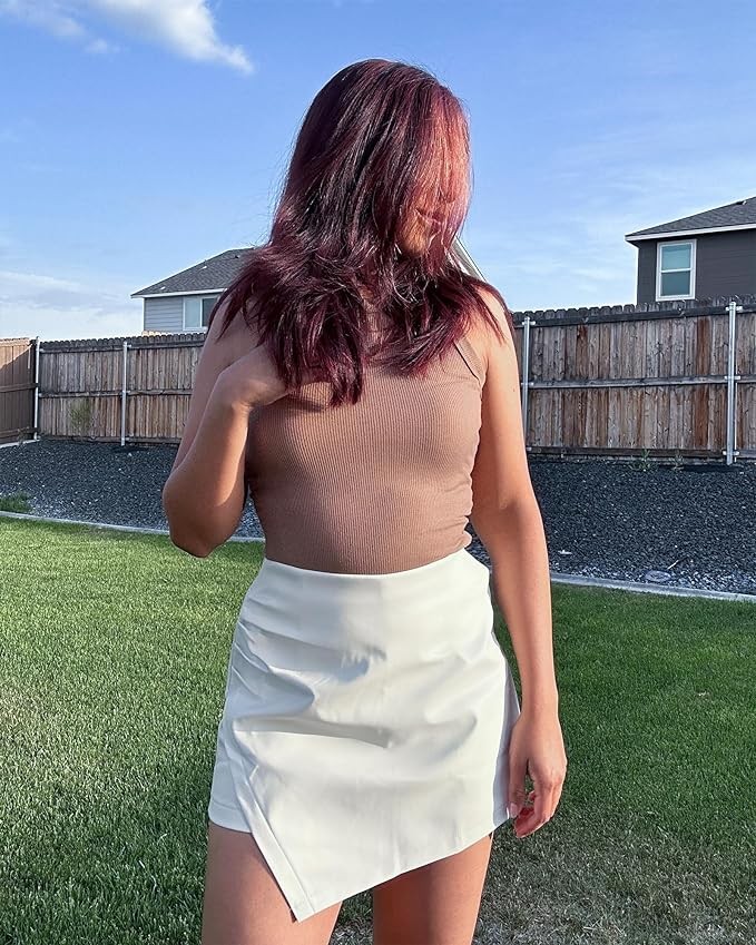 These skirt shorts feature high waist, elastic back, ruched side, asymmetrical hem. The cute outfits for women are made of slight stretch PU leather which is perfect for spring, summer, fall, and winter.