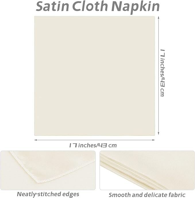 Size information: each satin cloth napkin measures 17 x 17 inches/43 x 43 cm in size, which is fit for decorating a table that can seat 8-10 persons; besides, the quantity of satin napkins is sufficient to meet your dining and decoration needs