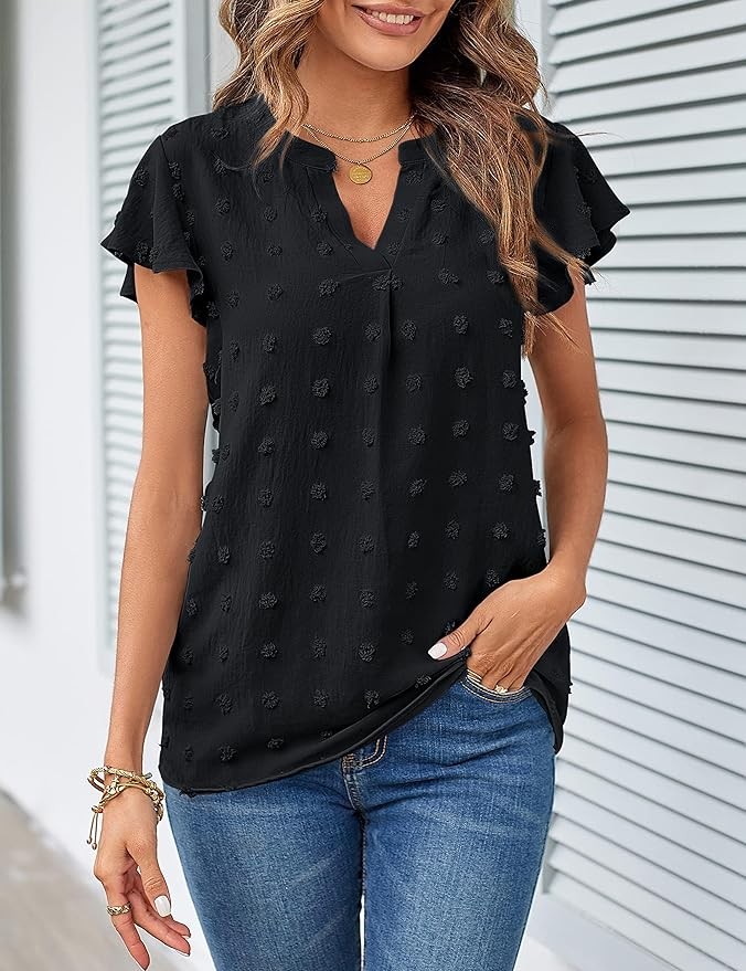 • Features: Solid color, flowy short sleeve, split v neckline, swiss dot fabric, no lined, front and back pleated design, summer tunic shirt, breathable, loose fit, fashion dressy casual blouse, pull on closure.