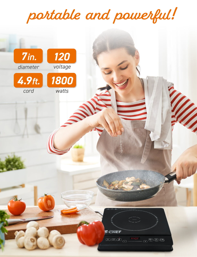 PORTABLE & POWERFUL: While our small induction cooktop (12.99” x 11.42” x 2.56”) is lightweight (6 lbs.) it packs a punch with up to 1800 Watts. Cook your favorite meals wherever you go—whether on vacation or in a small apartment, RV or dorm. This induction burner has a 7” diameter cooking ceramic surface that’s easy to clean and can accommodate some of your preferred pots and pans. Boil water, simmer tomato sauce or fry up your favorite protein with this portable single induction cooktop.