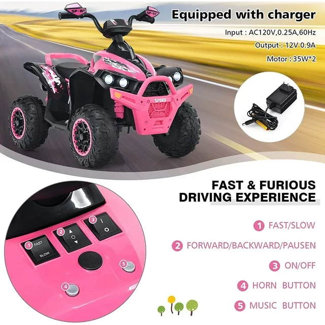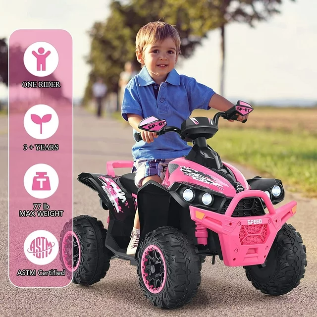 Features: Certified by ASTM and CPSIA Four durable wheels adapt to any road surface With horns and music to increase the fun of driving High and low speed, slow start to protect baby safety Safe and durable PP material and iron, in daily life can be used for a long time Our children's four-wheel drive ATV can bring children a real driving experience Specification: Motor:35W*2 Output:12V 0.9A Suitable Age:3 + years Main Material:PP + iron Input:AC120V,0.25A,60Hz Max Weight Capacity:77 lbs If you have any question, please feel free to contact us!