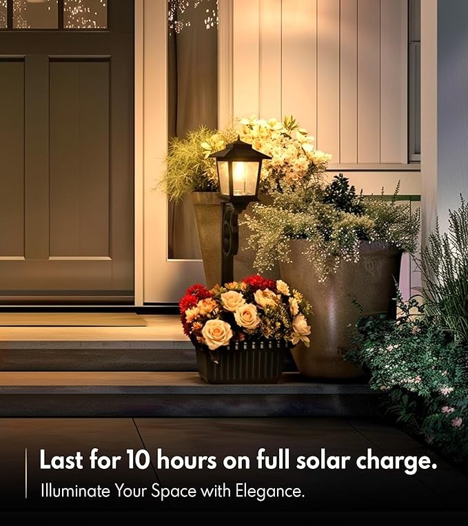 ?【2 in 1 Solar Lights】Solar lamp post light has 2 working options for you. You can put them flat on a surface as a pathway light, or hang them on a wall or spike them in your yard as a wall light. Wherever you want, this outdoor solar light can provide a bright view for you.Package includes 1 outdoor post light with plastic planter