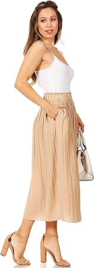 STYLE - Featuring a high waisted fit, chic pleated style and 2 side pockets, the midi skirt is the ideal piece your closet needs. The elastic waistband gives great stretch, and the in seam side pockets are great for carrying small items. The aline style falls to an elegant hem that hits at midcalf length.