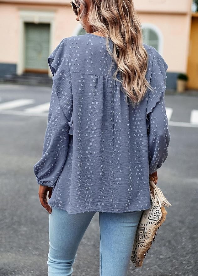 Design: Swiss dot fabric make this blouses for women fashion suitable for both dressy and casual occasions. Crochet and pleats at bust make this long sleeve tops feminine and chic, ruffle shoulder add cuteness for this blouses for women. Loose fit and tunic length are designed to be suitable for all body type, which can covers your hips
