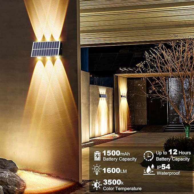【Outdoor Solar Wall Light】4pack upgraded version of the high-brightness up and down solar wall light uses 6 high-quality SMD5050 LED beads and a convex mirror design, the solar wall light can provide you with a bright and romantic lighting environment, creating a relaxed and comfortable atmosphere. Unleash the beauty hidden in the darkness for your outdoor fence, wall, garden, patio, deck, steps, window, porch, balcony or wall.note: Please press and hold the button for 5 seconds to turn on the light in a dark environment or cover the solar panel.