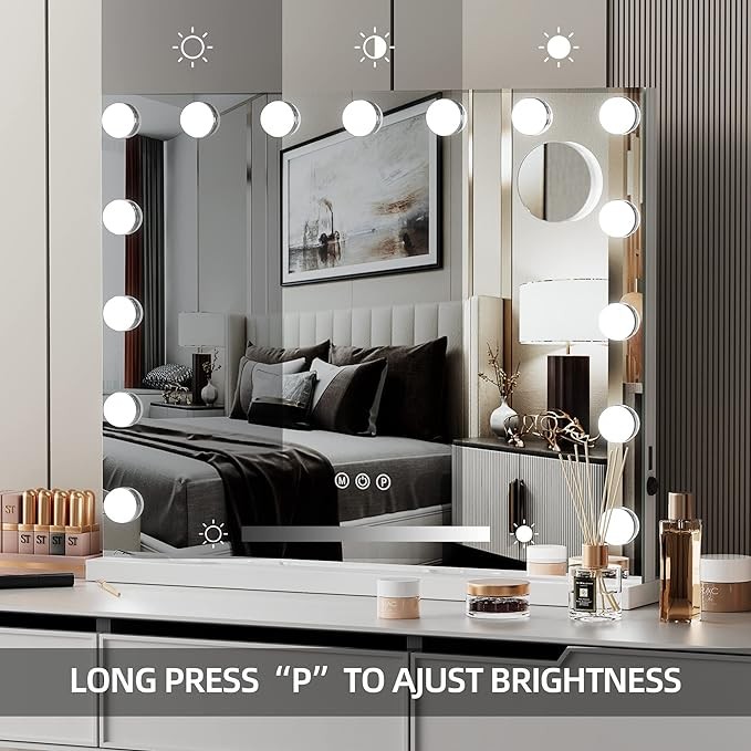 ??Smart vanity mirror with Touch Sensors✨✨: Simply touch turn on/off sensor to light up make up mirror, and change the 3 color modes( warm/natural/cool) by touch “M” sensor, Dimmable brightness from 10-100% by touch “P” accordance with you need while applying makeup. Also the smart makeup mirror with Intelligent light memory function, it will keep the state of your last use