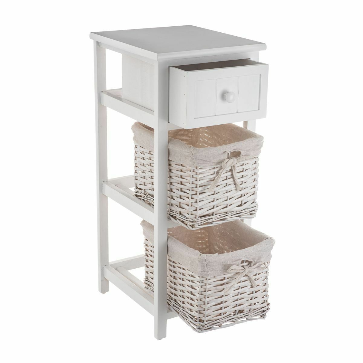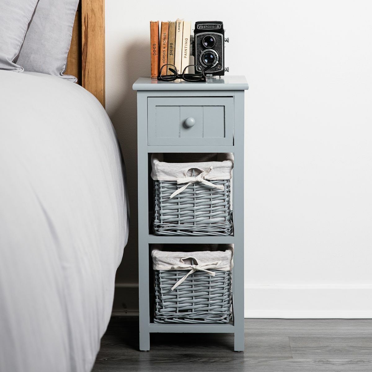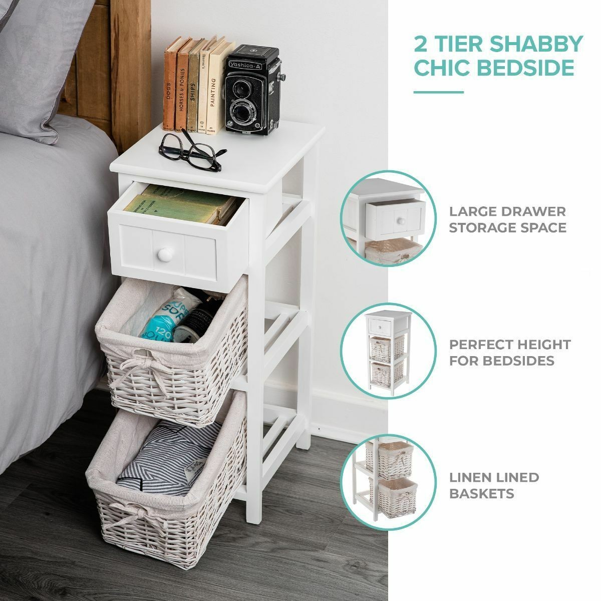 Shabby Chic Bedside Unit Tables Drawers Cabinet + Wicker Storage Wooden Bedroom