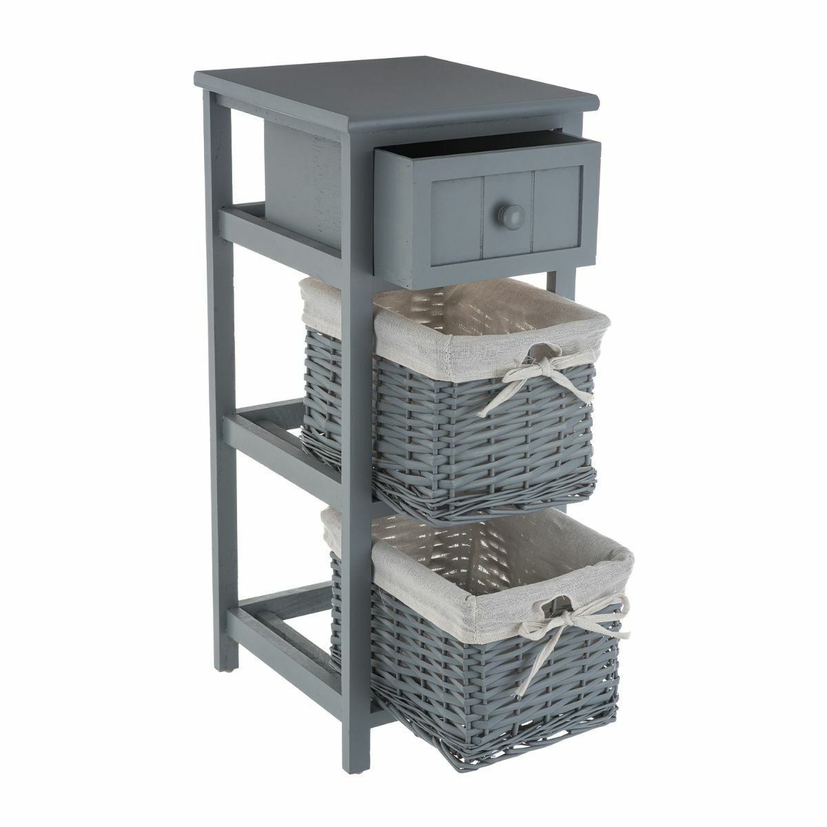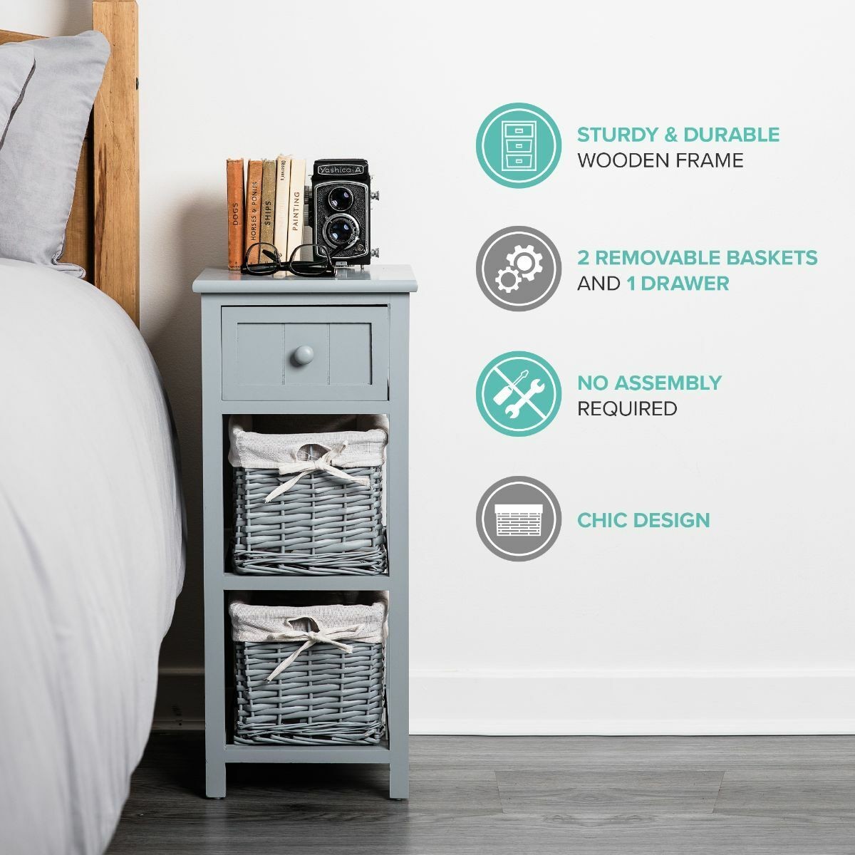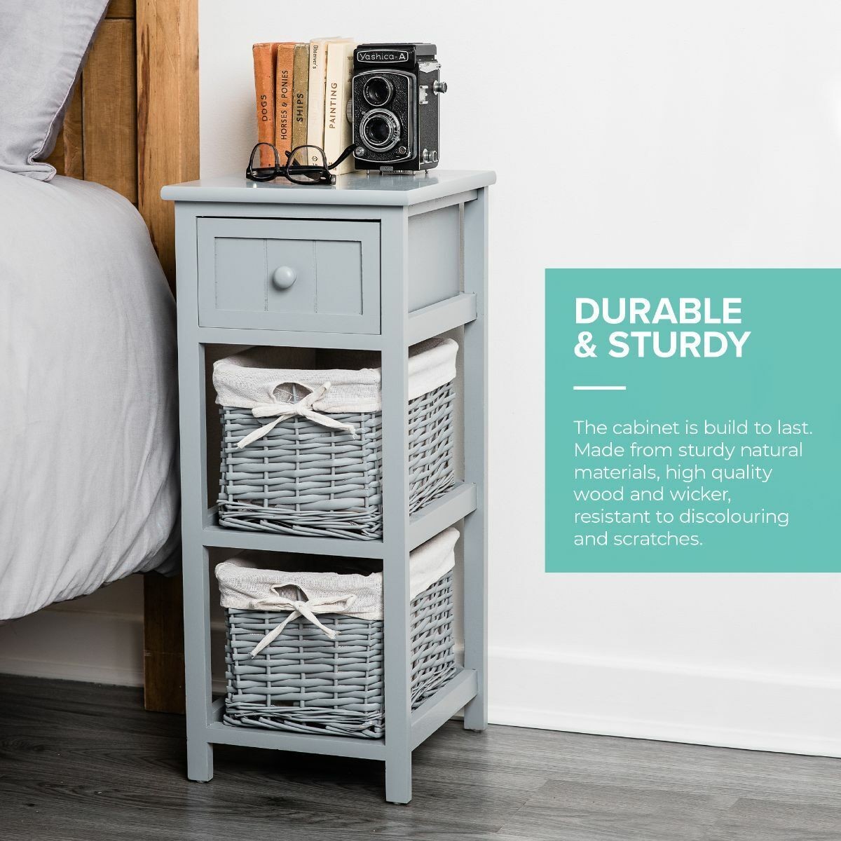 Shabby Chic Bedside Unit Tables Drawers Cabinet + Wicker Storage Wooden Bedroom