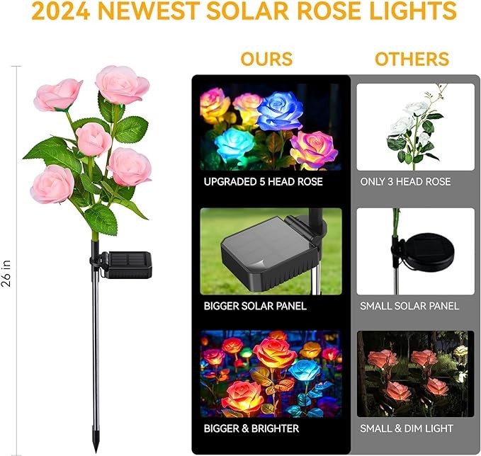 7 Color Changing Solar Garden Lights: 4 pack solar rose flowers lights feature 20 artificial roses that look incredibly realistic. The color-changing feature enhances the ambiance with its automatic transition between 7 different colors, creating a peaceful and romantic atmosphere in your gardens, yards, pathways, walkways, driveways or other place.
