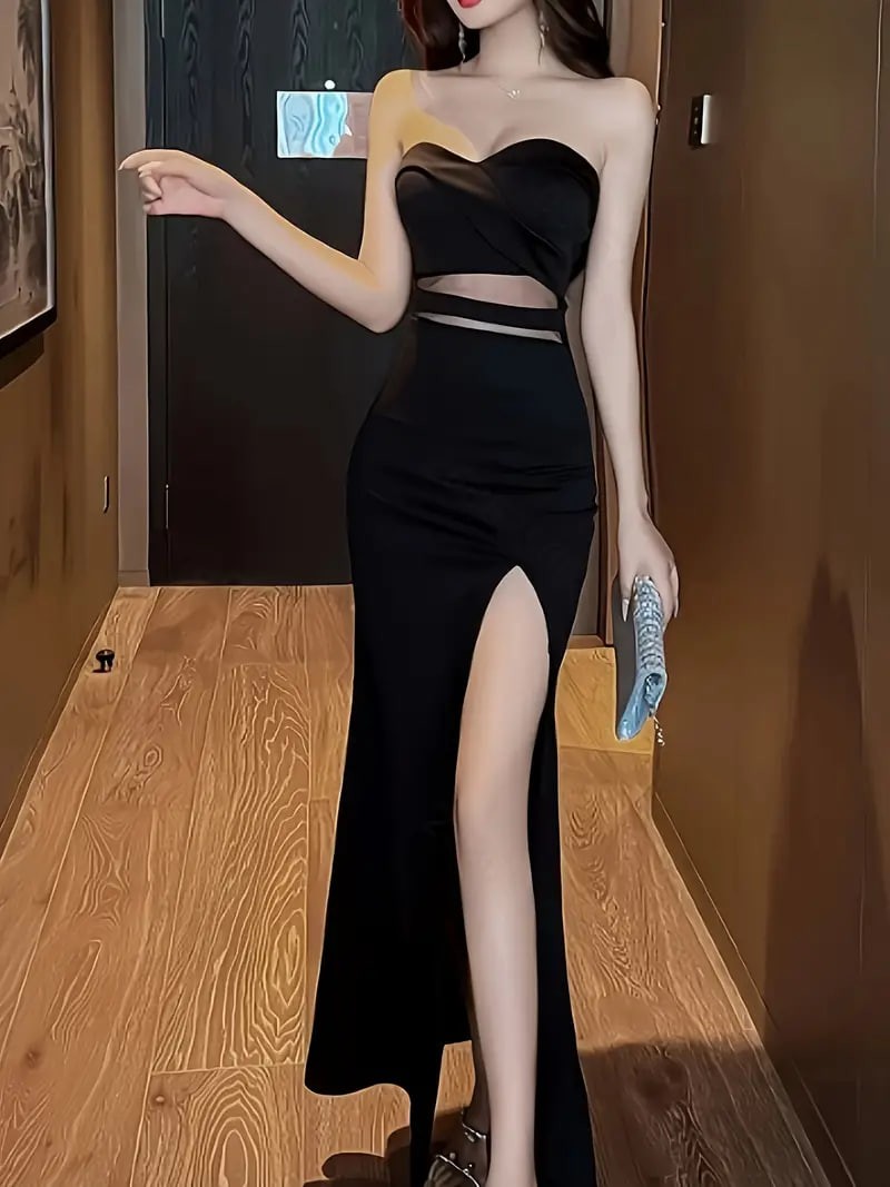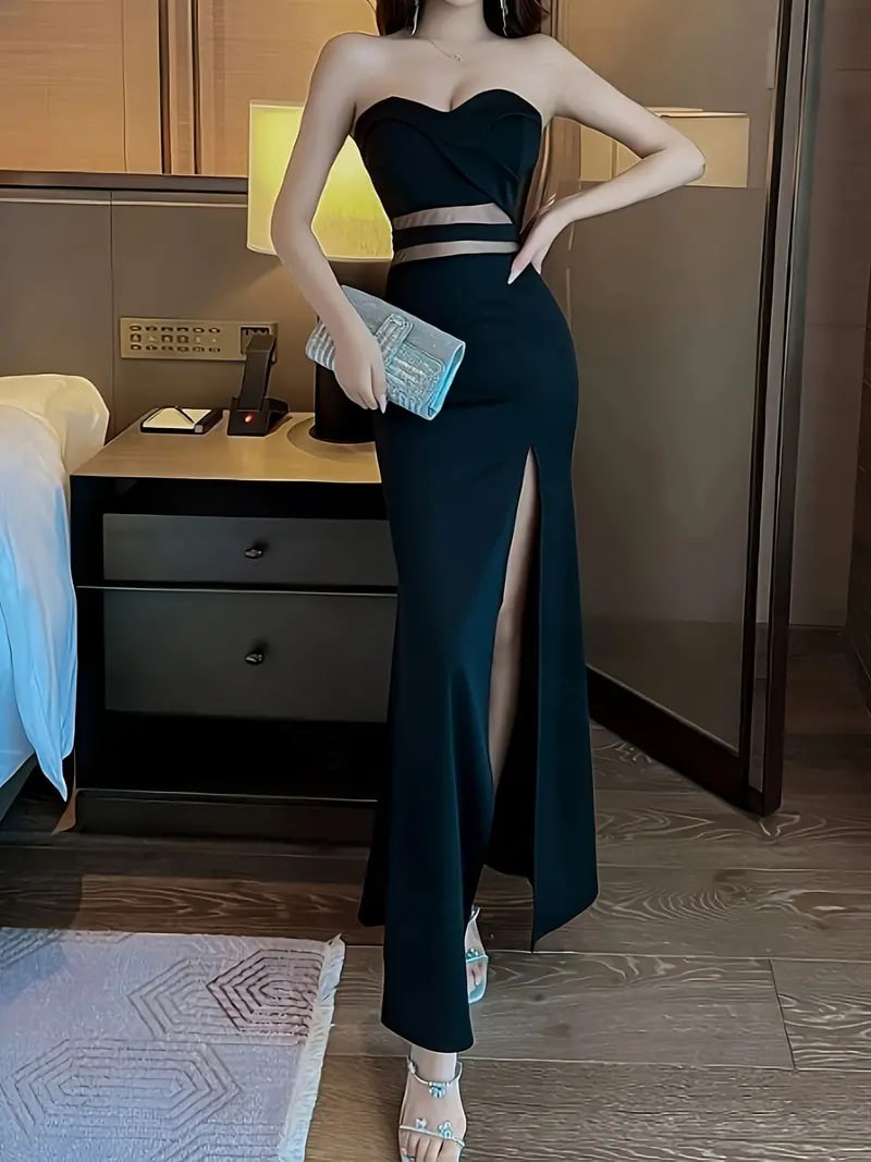 Solid Cut Out Split Thigh Tube Dress, Elegant Sleeveless Strapless Bodycon Dress, Women s Clothing details 1Solid Cut Out Split Thigh Tube Dress, Elegant Sleeveless Strapless Bodycon Dress, Women s Clothing details 1