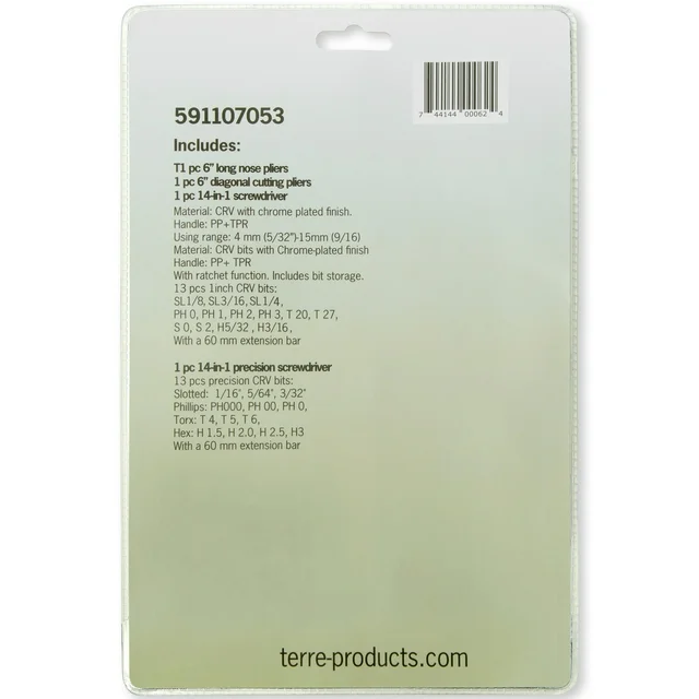14 in 1 precision screwdriver with 13 bits : Slotted 1/16", Slotted 5/64", Slotted 3/32" ; Phillips #000, Phillips #00, Phillips #0 ; Torx #4, Torx #5, Torx #6, Hex 1.5, Hex 2.0, Hex 2.5, Hex 3. Includes a 60mm extension bar.