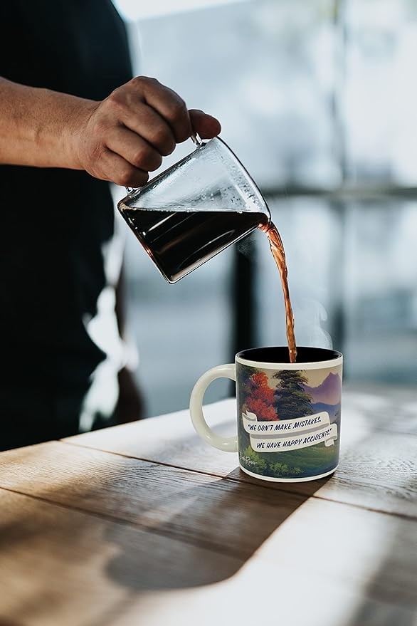 • When you pour in a hot beverage, a Bob Ross painting appears to inspire you. Officially Licensed by Bob Ross Inc.