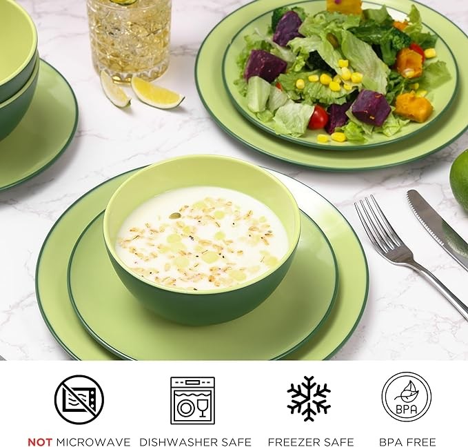 Dinner Service for 4: TP creative and healthy avocado green dishes set with brilliant glow, includes 4 of each - 28 oz bowls, 10.6’’ dinner plates, 8.7” salad/dessert plates.
