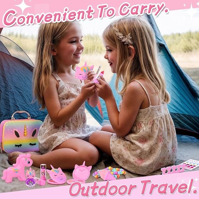 ?✨?【Perfect for Little Travelers 】– This kid-friendly makeup bundle features a fun built-in mirror and playful compartments to keep all beauty essentials organized. With its lightweight and compact design, it fits neatly into small bags or suitcases, making it an adorable travel pal for every adventure.