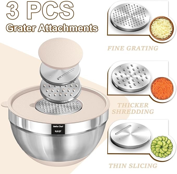 3GRATER ATTACHMENTS: This bowl set comes with 3 different grater attachments (slicing/grating/shredding) just shred or slice right into the bowl! without making a mess and eliminating the need for a cutting board to clean. 4qt had a removable lid inside the main lid, for adding contents or pairing it with your blender without removing the entire lid to prevent splash. For each cook enthusiast, this is a must in a kitchen! All necessary tools for cutting are very handy, easy to keep things clean around you