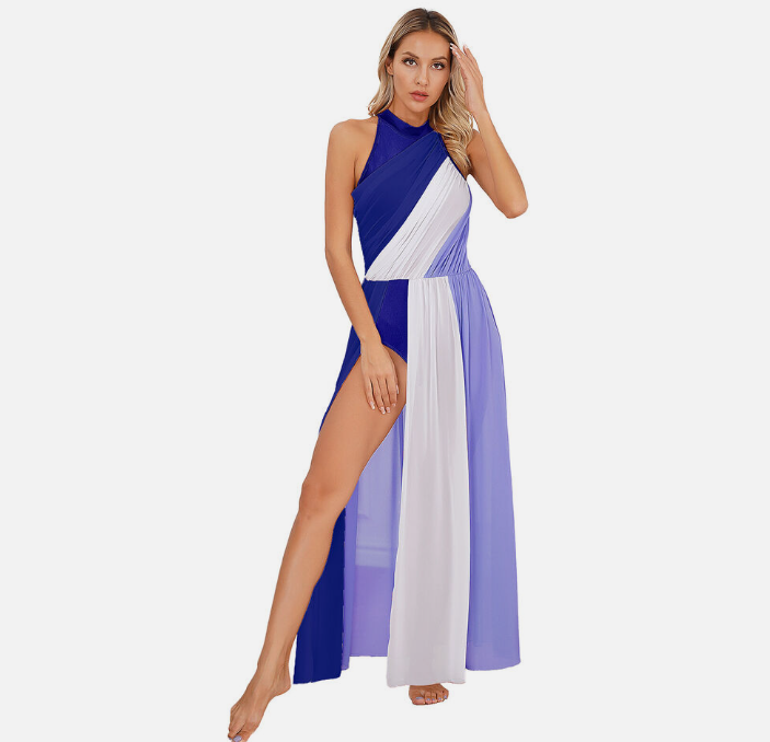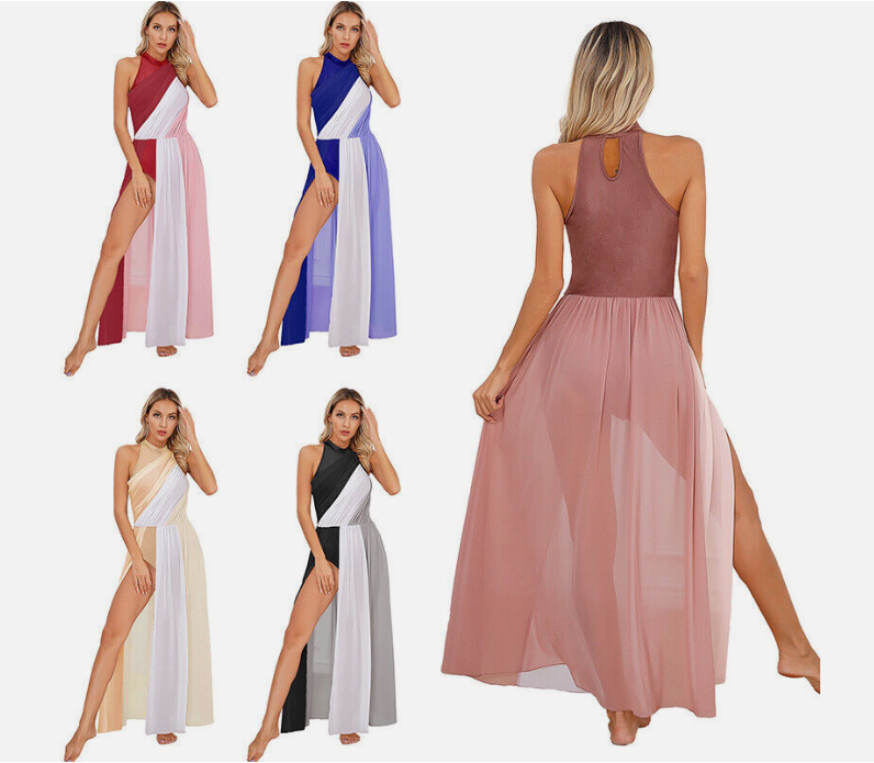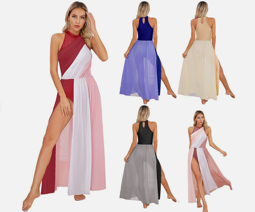 Sleeveless dance dress for women, color block design, bodice top with ruched chiffon overlay, unique and stylish.
