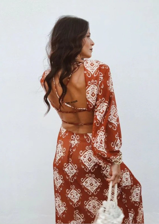 ZARA METALLIC MAROON V-NECK BAROQUE FLORAL PRINTED MIDI DRESS WITH CUT-OUT BACK