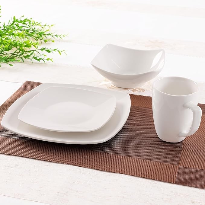 HIGH-QUALITY PORCELAIN: This sophisticated, premium-quality white dish set has the right balance of weight and size, making family mealtimes extraordinary for years to come. Our square dinnerware set is microwave and oven safe, making cooking simple and quick. Note: Handle with care, as the plates and bowls can get hot when placed in the microwave.